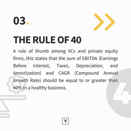 The rule of 40 https://www.wallstreetprep.com/knowledge/rule-of-40/ is a rule of thumb common among VCs and private equity in evaluating a good business. According to this rule, the sum of EBITDA (Earnings Before Interest, Taxes, Depreciation, and Amortization) and CAGR (Compound Annual Growth Rate) is greater than 40 for a good business.